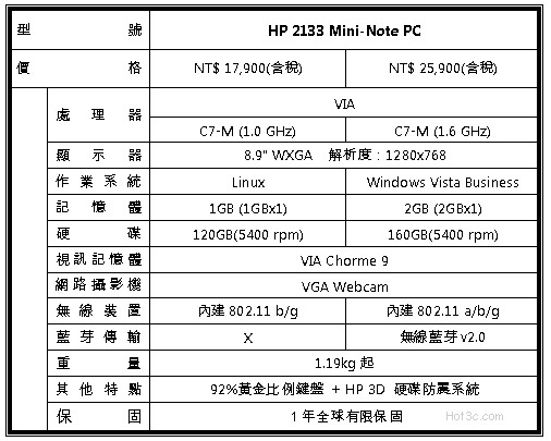 HP 本日(4/29) 正式在台發表 8.9吋迷你電腦 HP 2133 mini note PC。這款麻雀雖小、但五臟不僅俱全而且強悍的隨身電腦,正以華碩 Eee PC 為假想敵,處處也針對 Eee PC 的缺點而加強。譬如搭載了黃金比例大鍵盤、1280x768高畫質寬螢幕,而最高硬碟容量更達 160G,能輕易執行 Vista、XP。不只鎖定入門用戶,同時也是商務人士、學生、旅遊玩家居家旅行的首選。此外,而搭載了 VIA C7-M 超低電壓處理器也是一大特色。HP mini 詳細規格與售價如下: