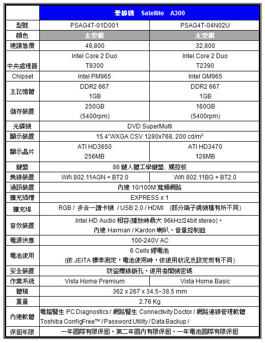 Toshiba A300 規格表