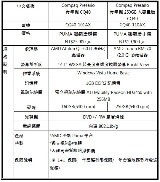 HP CQ40青年機規格表