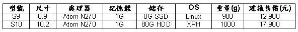 Ideapad S9與Ideapad S10備有多種鮮豔色彩的時尚外觀、配備85%大小的全功能鍵盤、並且採用LED背光螢幕、內建Wi-Fi無線連網功能,另外,內建Express Card、兩組USB、4 in 1 讀卡機插槽、Web-Cam等,採用英特爾Atom處理器、搭配Linux或微軟Windows XP作業系統,提供最佳運算效能。Ideapad S9、S10將內建1G記憶體、8G SSD固態硬碟或80GB傳統硬碟,含稅建議售價分別為12,900元與17,900元,詳細規格請參見附表如下: