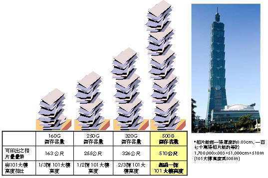 - 500G 可儲存170萬張照片(每張300K容量),相紙一張約0.03cm,相片紙(300K)每一張厚度約0.03cm, 一百七十萬張相片紙約等於1,700,000x.003=51,000cm=510M (101大樓高度為508M)