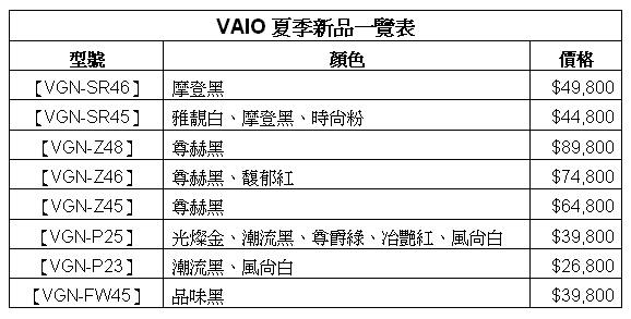 全新的VAIO【VGN-SR46】和【VGN-SR45】將於6月5日正式上市。【VGN-SR46】推出專業內斂的摩登黑,建議售價為新台幣49,800元;【VGN-SR45】則推出雅靚白、摩登黑和時尚粉三色,建議售價為新台幣44,800元。