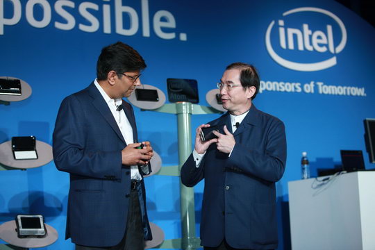 - 眾多採用Moorestown開發的裝置– Chandrasekher在演說中展示一系列設計,強調Moorestown的支援功能。他介紹了Aava Mobile、CCI、EB、英業達、廣達等公司的設計,並展示具吸引力的立體操作介面、HD影片、互動遊戲、豐富繪圖、以及3G語音等技術。廣達公司董事長林百里、仁寶公司資深副總經理沈俊德和Chandrasekher同台討論在這些領域的發展熱忱,並發表本身在Moorestown平台的發展計畫。