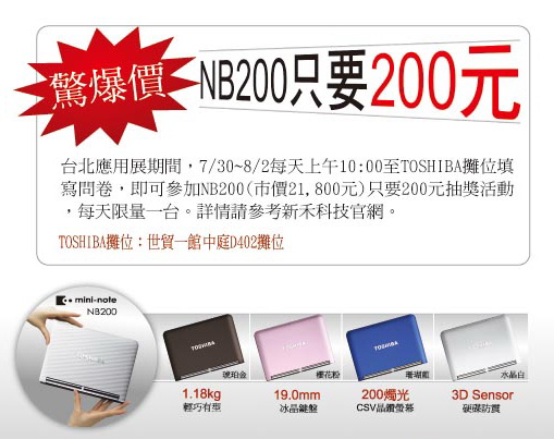 消暑何處去?!暑假最大電腦展,台北電腦應用展7/30~8/3台北世貿免門票參觀。TOSHIBA瘋狂夏殺館,天天限量推出超低價超值優惠商品,錯過再等一年。【瘋狂夏殺第一重】NB200只要200元排隊摸獎活動,TOSHIBA10吋小筆電NB200,超長10小時電池續航力搭載200燭光超顯亮螢幕及19.0mm全尺寸寬鍵盤;7/30~8/2天天有機會用200元將原價21,800元的四色NB200輕鬆帶回家,限量優惠就此一檔。【瘋狂夏殺第二重】TOSHIBA 儲存媒體,包含iSense V4愛線碟320GB、500GB及隨身碟、SD記憶卡等,通通也只要88元,數量有限,要搶要快!