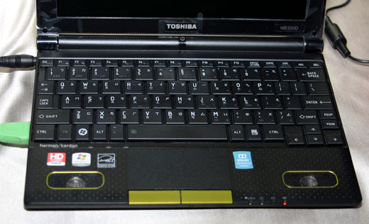 此外,Toshiba 也同時發表最新 NB500/520/550 小筆電,其中 NB520(Intel 處理器)、NB550(AMD 處理器)都搭載了 ATI HD 6250獨顯,因此圖形處理效能也相當突出,用來播放 720P 以上的影片都不是問題!但 NB520/550 更獨特是,還內建了harman/karsom喇叭,鍵盤下方的立體聲喇叭相當顯眼!