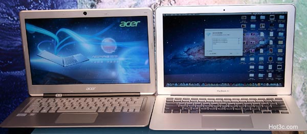 乍看之下,Aspire S3 處處都有 Apple MacBook Air(MBA) 的影子,或許也是故意選用介於 11.6吋與 13.3吋 MBA之間的規格以免與 Apple 正面對峙!(參考: Apple 發表二代MBA, Thunderbolt 螢幕) 很巧的,320GB HDD SSD版本 Aspire S3 定價剛好是兩款 11.6吋 MBA (NT$31900/$37900) 價格的平均值,240GB SSD版本 S3 則比 13.3吋/256GB Flash MBA的 $51900 便宜 $7000!