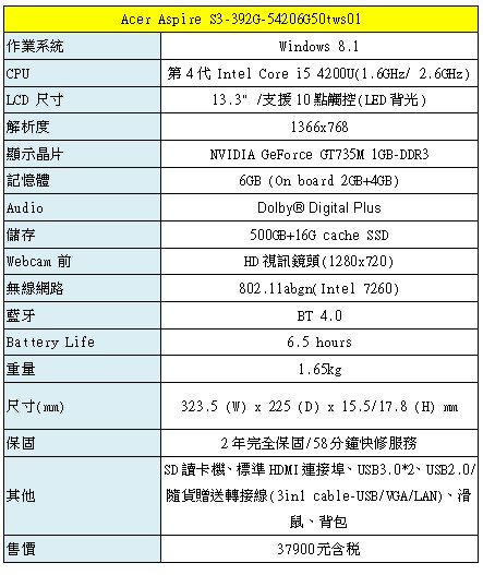 宏碁推出新款高階輕薄觸控Ultrabook-Aspire S3-392G,承襲Aspire S7亮白簡約設計,行動攜帶時尚便利,更加強影像處理效能:搭載第4代Intel處理器及NVIDIA高階獨立顯卡;採用13.3吋LED背光螢幕,支援十點觸控,配合專利雙力矩軸承設計,觸控操作穩定,加上快速開機、快速聯網的功能,滿足輕鬆娛樂、效率工作雙重需求,即日起台灣正式開賣,售價37900元。