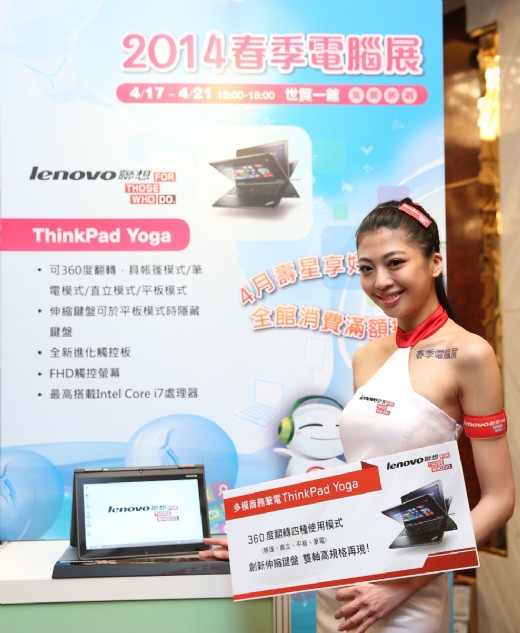 Lenovo聯想站穩全球第一大個人電腦品牌,並持續佈局PC+市場,2014年台灣開春第一場消費性電腦展-春季電腦展,Lenovo聯想將創新DNA融入一系列2合1新產品中,發表包含ThinkPad系列新品-ThinkPad Yoga,將Yoga系列360度翻轉設計融入經典ThinkPad商務筆電中,一機即可擁有筆電與平板雙用途,工作效率加倍;Flex系列生力軍- Flex20,直立時為AIO,平躺馬上變身大平板,多人共遊讓快樂因分享而雙倍加成;Lenovo聯想也推出超值新品優惠,買新一代X1 Carbon就送市值NT 6,600 1TB原廠密碼碟,買Yoga 2 Pro則可帶回當季限定粉嫩春心無線滑鼠(市值NT 690);專為小資族推出的G50-70,則隨機附贈市值NT990卡巴斯基防毒軟體,為親愛的筆電作安全把關。Lenovo聯想持續在PC+市場努力,於2014年春季電腦展為消費者帶來更符合需求的多模式使用、更具設計感的外型以及效能更好的系列產品。