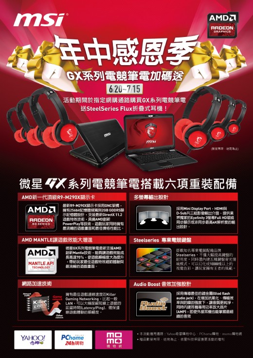 GX系列推出以來持續熱銷,為感謝消費者支持,即日起到7/15止,於YAHOO奇摩購物中心、PChome線上購物、momo購物網購買GX系列電競筆電,立即加碼贈送龍魂限定款SteelSeries Flux摺疊式耳機,送完為止!