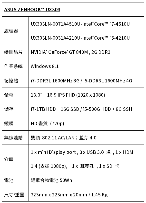 ZENBOOK UX303產品規格表