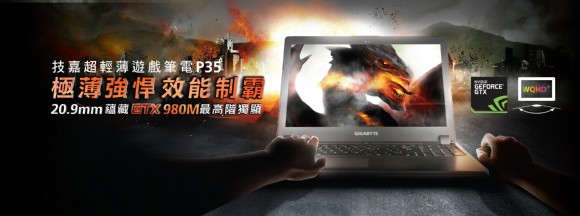 技嘉持續引領輕薄電競潮流,搶在NVIDIA 發表新一代GeForce GTX 980M和970M系列獨顯之時,推出最新15.6吋電競筆電P35X,為目前全球唯一搭載NVIDIA GTX 980M獨顯的15吋輕薄筆電,堪稱史上效能最強的神級機種!20.9mm超薄機身集結最高規獨顯NVIDIA GeForce GTX 980M GDDR5 8GB、第4代 IntelR Core i7處理器,搭配WQHD+高畫質廣視角螢幕*,解析度高達1620p,讓玩家感受細膩的視覺震撼。內建可抽換光碟機/硬碟插槽先鋒設計,支援高達兩顆512GB mSATA SSD +兩顆2TB HDD *飆速存取超大硬碟系統*,史上最強悍的電競規格配備濃縮在20.9mm的極薄金屬機身中,技嘉P35X讓玩家輕鬆攜帶、效能零極限!