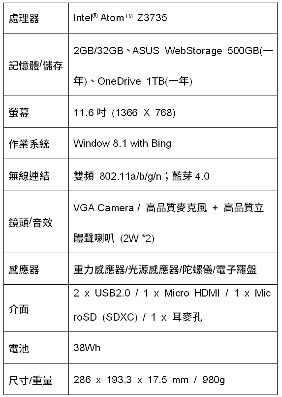 華碩筆電「EeeBook X205」擁有藍、白、金、紅四款時尚色彩選擇,外觀比A4紙還小,重量不到1公斤,攜帶方便。搭載IntelR Atom處理器,具低功耗及全天候高速運算能力,長效電池續航力最高達12小時。EeeBook X205採用最新Windows 8.1 with Bing作業系統並預建一年版MicrosoftR Office 365。內建32GB儲存空間,還可搭配Micro SD記憶卡插槽最高擴充64GB,並加贈一年ASUS WebStorage 500GB及OneDrive 1TB的雲端儲存空間,資料儲存不再受限於單一硬體,不論資料備份存取或影音儲存分享,皆暢行無阻,建議售價NT$6,680。