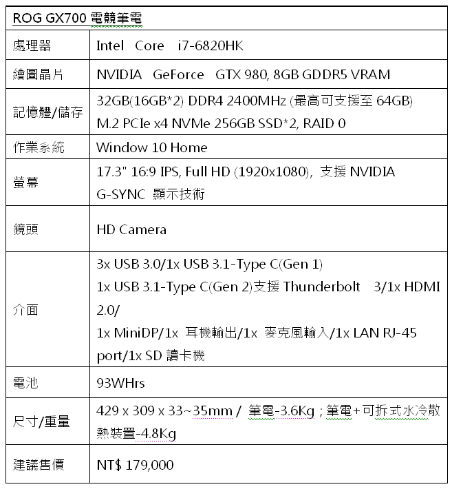 ROG GX700搭載32GB DDR4記憶體(最高可支援至64GB),以及兩顆256GB PCIe x4 M.2 SSD固態硬碟,開機、喚醒或啟動應用程式皆無須耗時等待;內建17吋Full HD (1920 X 1080)IPS面板,具備178〫超廣可視角,任何角度皆能忠實呈現細緻畫面,再搭配NVIDIA G-SYNC 顯示技術,可同步GPU及畫面更新率,避免出現影像卡頓延遲,提供疾速流暢的遊戲視覺體驗;玩家亦可透過獨家GameFirst III網路優化技術,調整應用程式使用網路之順序及速度,最佳化網路流量,提升多人連線遊戲效能,隨時保持傑出備戰狀態;此外,還配備ROG Gaming Center專屬按鍵,一鍵即可釋放記憶體空間、啟動三段超頻、管理個人化遊戲設定,以及剪刀腳設計背光鍵盤、獨立方向鍵,大尺寸觸控板等人性化設計。建議售價:NT$ 179,000,購買即贈ROG專屬行李箱,為裝置提供全方位精美防護。