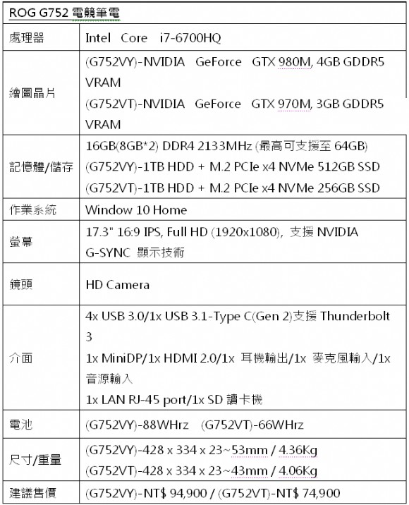 ROG G752系列電競筆電,亦是全球首款將均熱板整合至冷卻系統的電競筆電,透過內建結合雙銅製熱導管的獨家3D均熱板散熱系統(3D Vapor Chamber),可增加導熱係數、加速冷卻,提升GPU效能;搭配後排雙風扇散熱裝置,可有效將熱氣由後方風孔排出,冷卻效果超越市售同級競品;再加上獨特防塵散熱通道設計,可使灰塵遠離內部元件,延長使用壽命,提高運作時整體穩定性。ROG G752還配備符合人體工學設計之背光鍵盤,按鍵行程達2.5mm,觸感紮實靈敏;30顆防鬼鍵設計,即使一次按下多顆按鍵,亦可保有快速且精準的辨識與輸入。建議售價:NT$ 74,900(G752VT) / NT$ 94,900(G752VY)。