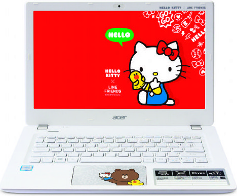 全球唯一、台灣限定!宏碁HELLO KITTY X LINE FRIENDS限定版筆電Acer Aspire V13,春季電腦展正式登場。13.3吋時尚白色機身,上蓋採用康寧玻璃獨特色彩噴墨技術,可愛玩偶圖案栩栩如生、色彩恆久鮮豔,兩大卡通明星、別緻Logo設計處處可見,隨機附贈專屬滑鼠、滑鼠墊、筆電包,更有多款獨家桌布與螢幕保護程式,時時於指尖賣萌。除可愛設計外,也具可靠內在:採用第6代Intel® Core i5處理器,具高效處理能力、加上內建搭載Dolby® AudioTM技術的強力喇叭,能提供劇院般的影音效果、配備4個USB連接埠,可支援最新USB3.1、還有Acer獨家護眼技術,長時間使用能保持舒適,春電展開放預購,售價23900元,還加送神秘小禮物。