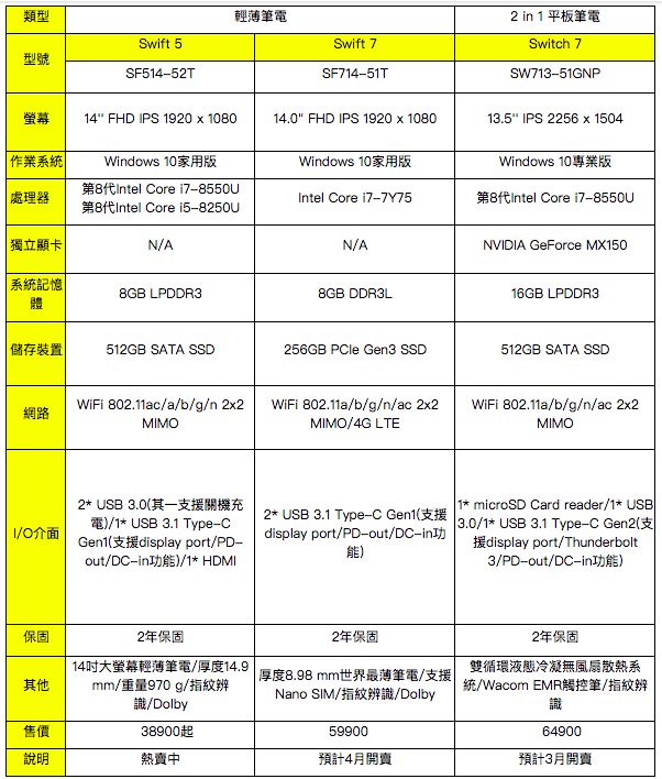 Swift 7 (SF714-51T) 採用康寧大猩猩玻璃CorningR GorillaR Glass NBT? 觸控螢幕和觸控板增強螢幕耐用度,主機搭載第7代 Intel Core i7 處理器、及Windows 10作業系統,256 GB SSD儲存、8 GB RAM ,售價不到6萬元,四月開賣。