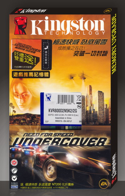 化身英勇的臥底警探,以時速180英里在車流中穿梭,躲避警察與對手的追逐,不斷挑戰車輛的性能極限,這一切驚險的電影場景,將由你自己擔綱演出!全球第一獨立記憶體模組製造商Kingston,特別與美商藝電(EA)進行跨業合作,共同推出《極速快感:臥底風雲》線上折價購活動 (欲知活動詳情,請參閱活動網站:www.kingston.com/taiwan)。即日起至2009年3月31日止,消費者只要於活動期間購買Kingston《極速快感:臥底風雲》包裝系列之記憶體模組產品,即可獲得《極速快感:臥底風雲》線上購買新台幣200元折價券。除此之外,還有機會在包裝盒上意外獲得Kingston 2008資訊月9折折價券,11月29日至12月7日資訊月期間,憑此券至Kingston攤位 (B526) 購買任一項產品,即可享有9折之優惠。Kingston《極速快感:臥底風雲》包裝版本記憶體模組產品現已於全台通路販售,伸張正義,盡情釋放內心對速度的渴望,現在就與Kingston一同體驗極速快感吧!