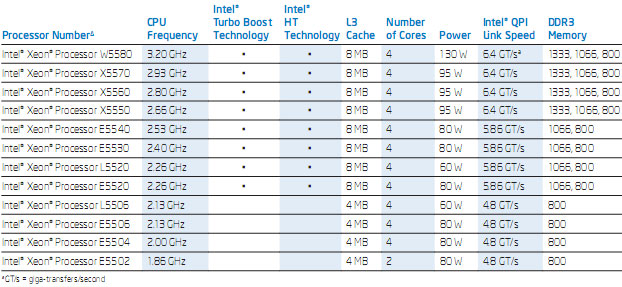 在伺服器應用方面,新款處理器時脈可達2.93 GHz,並支援1333 MHz的DDR3記憶體,耗電量介於60瓦到95瓦之間。在特定狀況下,依據處理器和系統配置的不同,Intel Turbo Boost Technology可提供高達3.33 GHz時脈的運算速度。在工作站應用方面,處理器時脈可達3.2GHz,耗電量130瓦,而透過Intel Turbo Boost Technology,配合不同的工作負載與環境,可提供高達3.46 GHz的運算速度。這些處理器內建達8MB的L3快取記憶體。