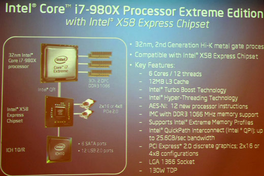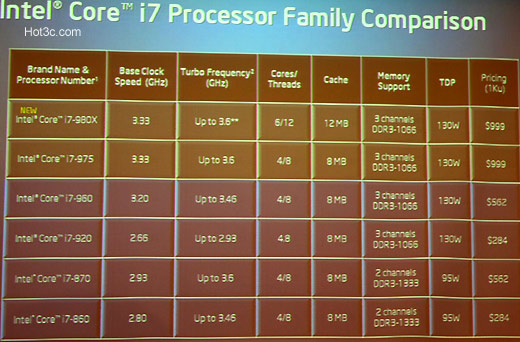 Intel 今日全球同步發表最新六核心重量級 CPU: i7-980X。這顆 32nm製程、3.33GHz、6核 12執行緒的處理器,也支援 Turbo Boost 可動態超頻至 3.6GHz,並搭載了 12MB L3 共用 cache,將是目前 Intel 家用桌機處理器中效能最強的一顆!