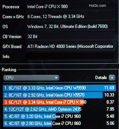 在 Cinebench 11.5 測試下,分數達 8.37,遠遠超過先前的 i7-960: