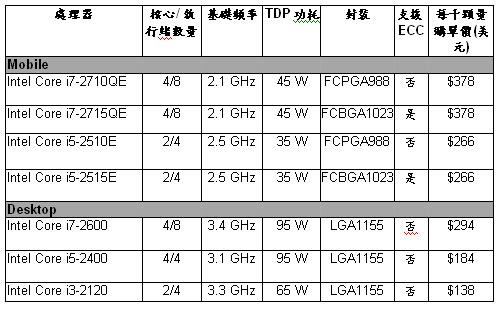 Core i7-2710QE 與i7-2600; Core i5-2400; 以及Core i3-2120即日起開始供貨。支援ECC功能的BGA封裝Core i7與i5處理器,以及Core i5-2510E預計在60天內供貨。提供7年生命週期支援的Intel Core處理器,每千顆量購單價從138美元至378美元不等。