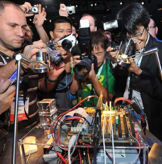 展望未來,歐德寧預測平台電力的創新將達到今日難以想像的水準。他展示一款英特爾架構開發晶片(research chip),稱之為 “近臨界電壓處理器”,突破電晶體科技的許多極限,使耗電達到極低的水準。在台上展示的一款Windows PC,僅用一片郵票大小的太陽能電池就能提供電腦運作所需的電力。