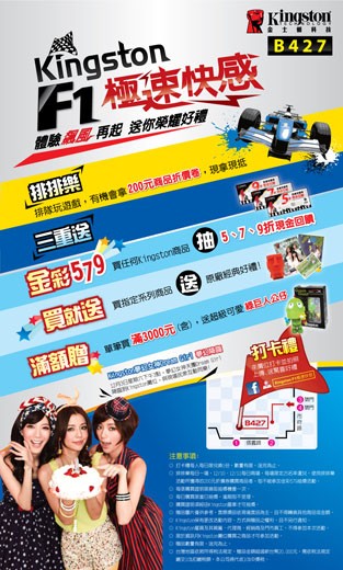 Kingston 100年台北資訊月記憶體及儲存設備新品尬速亮相、活動花樣百出,熱情邀請消費者一起感受F1級的極速快感!今年Kingston將以充滿濃厚賽車風格的攤位設計,充分表現出旗下各式高效能記憶體、儲存設備產品的高速特色。以「Kingston F1極速快感」為主題,Kingston將為各位消費者帶來賽車甜心的性感熱舞、Dream Girls風靡全場的夢幻魅力、與多重的購物好康,所以100年台北資訊月,Kingston攤位絕對是必遊之地!資訊月期間,凡消費者至 Kingston攤位購買商品,即可抽現金回饋券,最高五折的現金回饋,為您立即省下荷包;若消費者購買SSDNow系列固態硬碟、Wi-Drive、HyperX系列、系統專用記憶體等指定商品、或消費金額達3000元,還有Kingston限量原廠好禮送給您,各式獨家贈品通通免費帶回家!