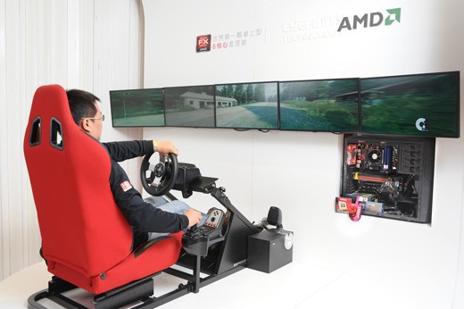 AMD品牌概念館除了展示最新的AMD主機板和顯示卡產品,更展出多款搭載AMD APU的筆記型電腦,輕薄亮麗的時尚外型、全天候的電池續航力、及讓消費者能輕鬆擁有的親民價格。AMD品牌概念館設置多個體驗區,包括5螢幕賽車遊戲區,使用坐擁金氏世界紀錄最高時脈的AMD 8核心FX處理器,以及全球速度最快的AMD Radeon HD6990顯示卡,現場更設有高級賽車座椅,讓民眾現場親身體驗<<越野精英賽:大地長征3 >>最具衝擊性的遊戲畫面、享受最具臨場感的越野快感!現場另設有投影機三螢幕體驗區,將AMD獨家Eyefinity多螢幕輸出技術發揮的淋漓盡致、推向另一個應用高峰,更有AMD APU家庭劇院展示區,讓消費者親身體驗AMD的數位科技新生活。