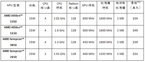 AMD Athlon與AMD Sempron APU為消費者提供一個四核心解決方案,包含2個SATA 6 Gbps埠、2個USB 3.0埠、8個USB 2.0埠以及PCIe 2.0插槽,可搭配顯示卡的升級;另加上3個影像輸出端(包括DisplayPort、HDMI及VGA),售價從40美元以下起註1。AMD AM1平台擁有比競爭對手最大高達3倍的運算效能,藉由支援DirectXR 11.2與Windows 8.1,為主流市場帶來平衡的運算性能註2。