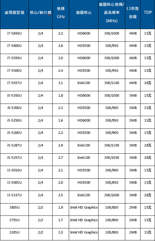 全新第5代 Intel Core (酷睿)處理器系列為英特爾最新一波的14奈米產品,不僅擁有更好的系統與繪圖效能,帶來更自然與逼真的使用者經驗,同時也具備比先前世代產品更長的電池續航力。新上市的第5代Intel Core技術包含14款消費與商用型處理器,其中10款是內含Intel HD Graphics的15瓦版本,另外4款則是內含Intel Iris(鋭炬) 繪圖晶片的28瓦版本。針對新一代運算裝置量身打造的第5代Intel Core處理器,能在不同種類的裝置上創造更輕薄便攜且更有效率的經驗,其中包括傳統的筆電、二合一(2 in 1)、Ultrabooks、Chromebooks、桌上型整合式全功能(all-in-one)電腦、以及迷你PC等產品。隨著第5代Intel Core處理器的問市,「Broadwell」微架構將成為英特爾史上轉換至新平台速度最快的行動平台,為消費者提供多元化的裝置選擇。