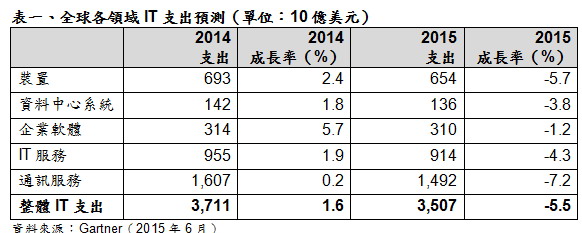 國際研究暨顧問機構Gartner最新預測顯示,2015年全球IT支出的規模為3.5兆美元,較2014年減少5.5%。分析師表示,IT支出下滑主要係美元升值所致,若以固定匯率(constant currency)計算則將成長2.5%。Gartner之前於4月份發表的預測,全球IT支出若以美元現價為準將下滑1.3%,若以固定匯率計算則成長3.1%。