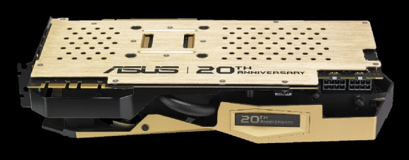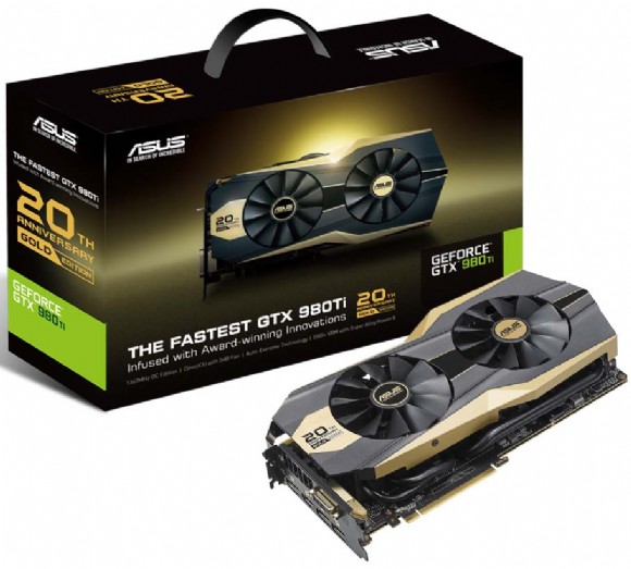 華碩繼去年4月推出20周年黃金限量版GTX 980顯示卡後,今日再推出一款全新20周年黃金限量版GTX 980 Ti顯示卡,GTX 980 Ti顯卡採用GeForce GTX 980 Ti圖形處理器(GPU),可提供超高時脈達1367MHz,於3DMark 11 Extreme跑分測試中,效能更遠超越公版顯示卡達21.6%,而在執行《俠盜列車手 5》(GTA V) 時,還可大幅提升22.1%遊戲效能。