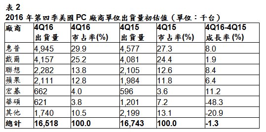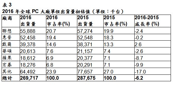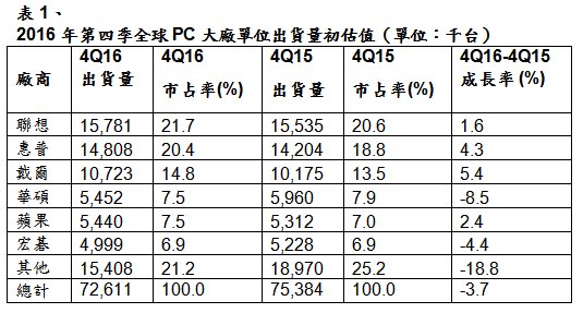 根據國際研究暨顧問機構Gartner初步統計結果顯示,2016年第四季全球個人電腦(PC)出貨量總計7,260萬台,較2015年第四季下滑3.7%。2016全年PC出貨量總計2億6,970萬台,比2015年減少6.2%。自2012年起,PC出貨量便持續呈現逐年下滑的局面。
