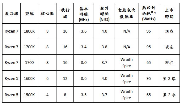 三款8核心Ryzen 7桌上型處理器今日起正式上市。AMD預計在今年第二季推出6核心與4核心的Ryzen 5系列處理器,接著在今年稍後推出Ryzen 3,為主流市場提供更高效能的產品。所有Ryzen處理器皆支援全新AM4架構,各大ODM廠商將推出相對應的主機板設計。