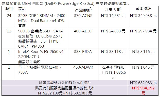 比較了預先完整配置此 OEM 伺服器所需的總成本,以及購買基本配置伺服器、自行組裝記憶體和硬碟的總成本,得知每部伺服器可節省的成本為 NT$ 227,382 元。(如下圖表,預先完整配置伺服器成本 NT$ 934,192 元 – 自行組裝基本伺服器成本 NT$ 706,810 元。)