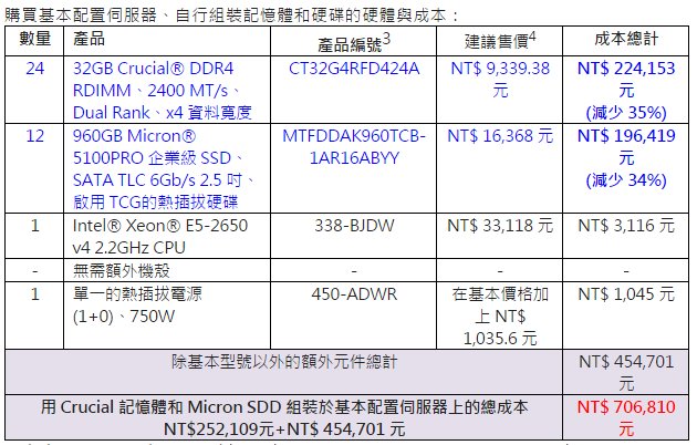 為何透過自己組裝 DRAM 和 SSD 的新伺服器是很值得的,且又如何能做到節省高達 35% 的費用?藉由實際比較,可以清楚說明一切。為了觀察新增硬體到 OEM 伺服器的效果差異,比較了兩種做法的成本。一種是購買完整配置的伺服器。另一種是購買只有基本配置的伺服器,然後使用零件市場的記憶體和 SSD 進行升級。就現實情況作比較,選擇了受歡迎、可升級和高效能的 DellR PowerEdge R730xd,然後用基本型號比對製造商網站上完整配置的型號。一部基本配置伺服器的費用包含一個已安裝的 IntelR XeonR E5-2650 v4 2.2GHz 處理器、一個已安裝的 32GB 2400 MT/s DDR4 RDIMM、一個可搭載多達 12 個 3.5 吋硬碟抽取盒的機殼、一個已安裝的2TB 7.2K RPM SATA 6Gb/s 3.5 吋熱插拔硬碟以及一個 495W 電源。2 在比較當下,此基本配置伺服器的費用為 NT$252,109 元。(價格時有浮動,但裝載齊全的配置和後來升級型號之間價格的相對比率,則不會有太大的改變。)