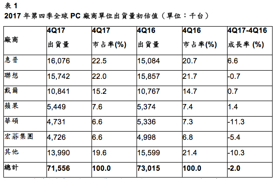Gartner初步統計結果顯示,2017年第四季全球個人電腦(PC)出貨量總計7,160萬台,較2016年第四季下滑2%。2017全年PC出貨量超過2億6,250萬台,較2016年減少2.8%。儘管全球PC季出貨量已連續十三季下滑,年出貨量也是連續第六年下滑,但Gartner分析師認為市場已出現部分樂觀跡象。