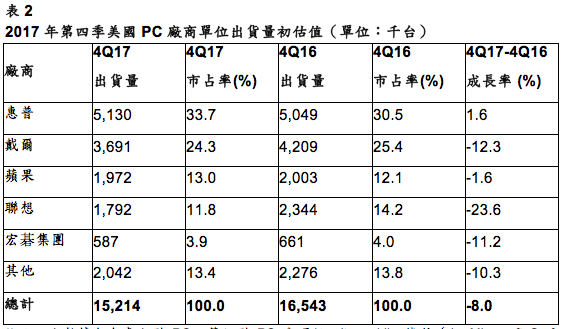 在美國,2017年第四季PC出貨量超過1,520萬台,較2016年第四季下滑8%(見表2)。2017年第四季除惠普以外前五大廠商中有四家在美國的出貨量下滑,主要是因為節慶促銷活動仍然無法帶動疲軟的消費者需求。