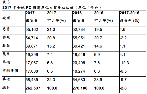 整體而言2017年全球PC出貨量總計2億6,250萬台,較2016年減少2.8%(見表3)。隨著PC產業持續趨於穩定,前四大廠商占2017年全球PC出貨量的64%(2011年時前四大廠商占PC出貨量僅45%)。
