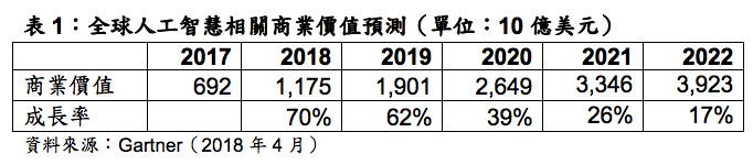 目前人工智慧商業價值呈現新興技術最常見的S型曲線成長模式。2018年全球人工智慧相關商業價值的成長率預估為70%,但在2022年成長將趨緩(見表1)。整體而言2020年後成長曲線將趨於平穩,造成未來幾年將出現低成長率。