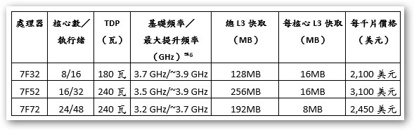 新推出的3款處理器包括AMD EPYC 7F32(8核心)、EPYC 7F52(16核心)、以及EPYC 7F72(24核心),進一步拓展AMD第2代EPYC在執行各種工作負載的效能領先地位,發揮高出達500 MHz的基礎頻率以及大容量快取的優勢,讓AMD EPYC成為全球每核心效能最高的x86伺服器CPU*註1。