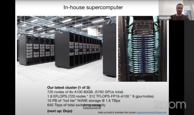 特斯拉 (Tesla) 人工智慧部門資深總監 Andrej Karpathy 於 CVPR 2021 大會中,宣布自家用於訓練自動輔助駕駛與自動駕駛功能的深度神經網路超級電腦。該叢集使用 720 個節點,每個節點搭載 8 個 NVIDIA A100 Tensor 核心 GPU (共 5,760 個 GPUs),以 1.8 exaflops 的運算效能表現引領業界。Karpathy 表示:「這是一台令人難以置信的超級電腦。我相信針對其每秒浮點運算,這將是全球排名第五的超級電腦。」