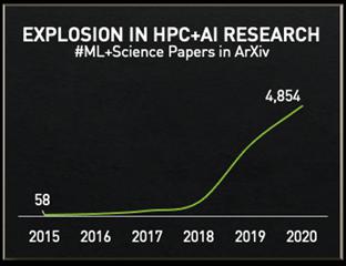 微軟的 GPU 加速 Azure 超級電腦衝上第 10 名,這是雲端超級電腦系統首次進入前 10 名,突顯出新一代雲端原生系統的萌芽。人工智慧 (AI) 也為科學運算領域帶來革命性的變化。近年來,利用高效能運算與機器學習進行研究的論文數量激增;從 2018 年大約 600 篇,到 2020 年增長到近 5000 篇。