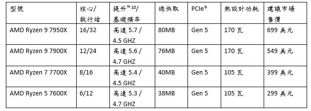 Ryzen 7000系列桌上型處理器預計從9月27日起透過全球各大電子與實體零售通路販售,建議市場售價從299美元起。