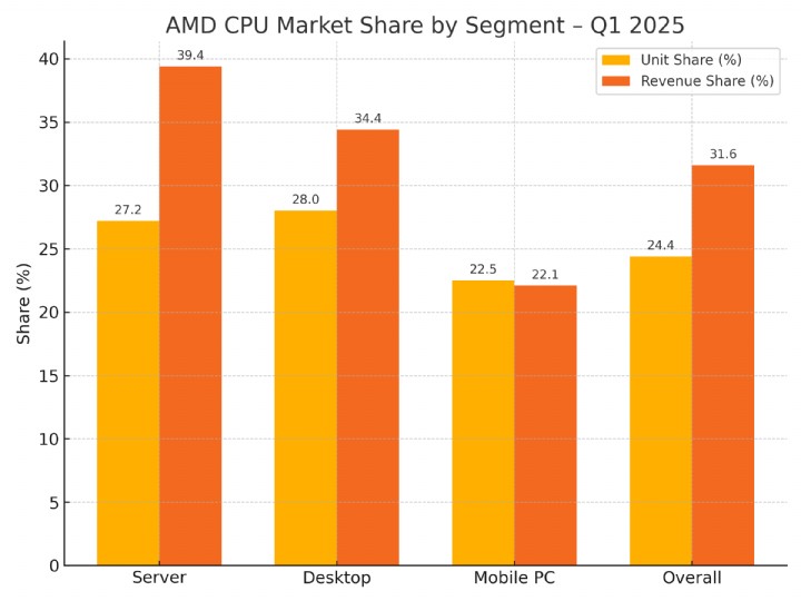 Mercury Research 最新報告顯示,AMD 於 2025 年 Q1 的伺服器營收市佔率再創紀錄,來到 39.4%,較上一季增加 3.1 個百分點 (pp),年增 6.5 pp。在出貨量(單位市佔)方面,AMD 也升至 27.2%,季增 1.5 pp,年增 3.6 pp。 驅動因素:- 大型雲端服務商導入第五代 EPYC Genoa/Bergamo 平台,主打更高核心數與每瓦效能。