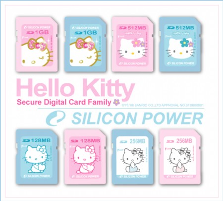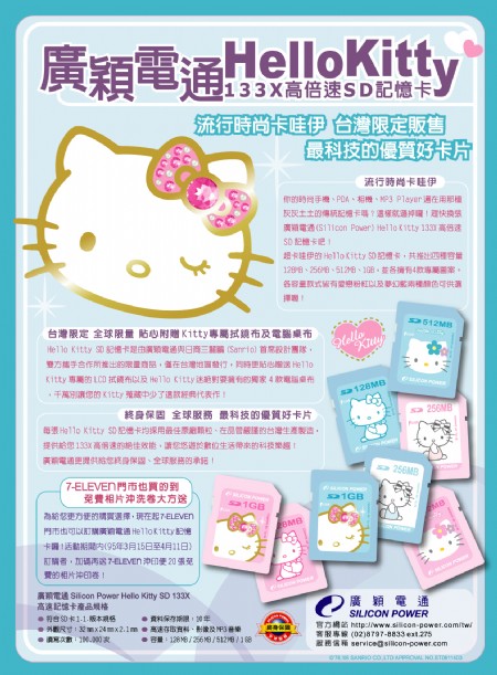 超卡哇伊的Hello Kitty SD記憶卡是由熱銷全球90餘國的廣穎電通 (Silicon Power),暨推出席捲台灣蝙蝠俠迷收藏慾望的全球限量記憶卡後,特別委託日商三麗鷗(Sanrio)首席設計團隊,雙方攜手合作所推出的台灣區限量商品。首批Hello Kitty SD記憶卡共推出四種容量:128MB、256MB、512MB及1GB,並各擁有四款專屬圖案,各容量款式皆有愛戀粉以及夢幻藍兩種顏色以供選擇,完美滿足Hello Kitty迷需求。此外,為了回饋消費者的支持與愛護,廣穎電通更貼心地加贈Hello Kitty專屬的LCD拭鏡布以及Hello Kitty迷絕對要擁有的獨家四款電腦桌布,千萬別讓您的Kitty蒐藏中少了這款經典代表作喔!