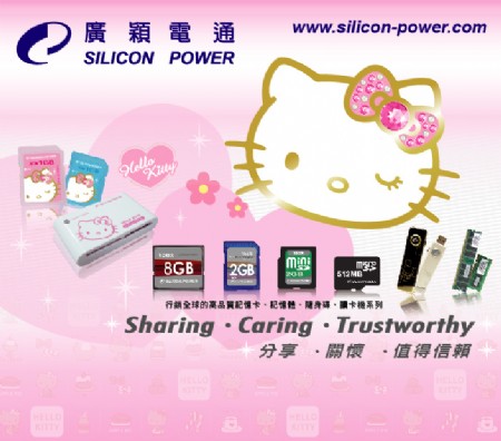 廣穎電通(Silicon Power)與日本三麗鷗集團聯手打造全球首批Hello Kitty SD記憶卡熱賣全台之後,今年夏天,廣穎又推出浪漫時尚的Hello Kitty彩繪組合包,此款組合包有愛戀粉紅與夢幻粉藍兩款顏色選擇,結合台灣區限量專賣的Hello Kitty 133倍速(133X) 1GB Secure Digital (SD)高速記憶卡與Hello Kitty 17合1讀卡機,在全台再度掀起Kitty迷的狂熱搶購!今年廣穎特別受邀與華研共同參展,攤位上將展售華研新推出Hello Kitty燒錄片與廣穎Hello Kitty全系列133X SD記憶卡與讀卡機系列,雙方攜手打造專屬於台灣消費者獨有的Hello Kitty數位夢幻王國。活動現場只要購買華研數位相機X8鈦銀機,就可獲得廣穎Hello Kitty SD愛戀記憶卡256MB乙張 (限量100張)。