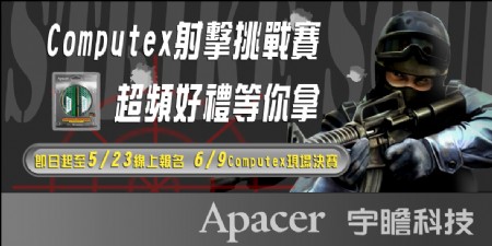 記憶體大廠Apacer宇瞻科技將於2007computex現場舉辦【computex射擊大賽】活動,採用目前最頂極的宇瞻DDR2 1200 plus超頻記憶體模組,讓玩家們能於第一時間體驗宇瞻最新、最快之超頻系列記憶體模組。