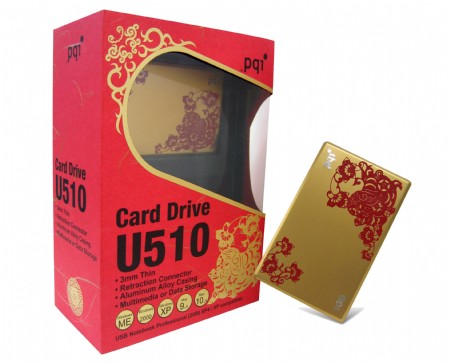 「PQI Card Drive U510名片碟-富貴金豬迎新春賀歲款」,為顯珍藏價值,全球僅限量推出1,500套,期望能吸引名片碟愛好者的目光及收藏。PQI承襲Card Drive以往的風格,外表以細緻的髮絲紋處理,襯托出高質感的金屬光澤。為呼應春節的到來,更選用有著富貴涵義的金黃色作為主色,搭配喜氣洋洋的紅色的”豬寶寶圖騰”剪紙,更顯富貴喜氣。吉祥的名稱與討喜的外表,產品尚未推出,即受到熱烈迴響。