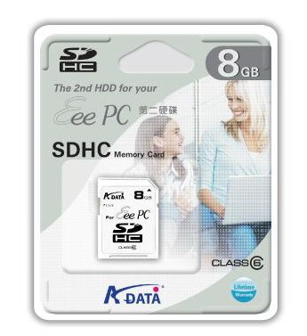 Eee PC以簡單、輕薄、易用的產品特性,一上市就造成話題,也成為大家最想要的禮物選擇之一!威剛科技推出限定版Eee PC專用SDHC 8GB記憶卡,讓擴充Eee PC容量就是這麼的esay!透過Eee PC內建讀卡機,威剛SDHC記憶卡彷如您Eee PC的第二顆硬碟。威剛SDHC記憶卡擁有8GB的超大容量,可輕鬆儲存4,000~6,000張照片,超過2,000首歌曲或高達14~16小時MPEG4視訊錄影。透過Eee PC的內建讀卡機,將可讓您把SDHC記憶卡當作另一顆硬碟使用,輕鬆儲存各式檔案。